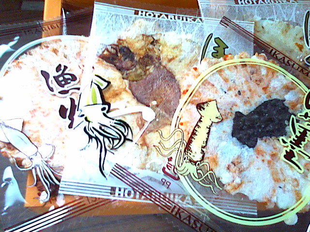 えびせん、3種類入ってます。普通のと、ホタルイカ入りと、イカ墨入り。
